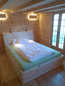 Lit en arolle, avec ouverture à piston pour rangements sous le matelas. Eclairage de lecture à LED.